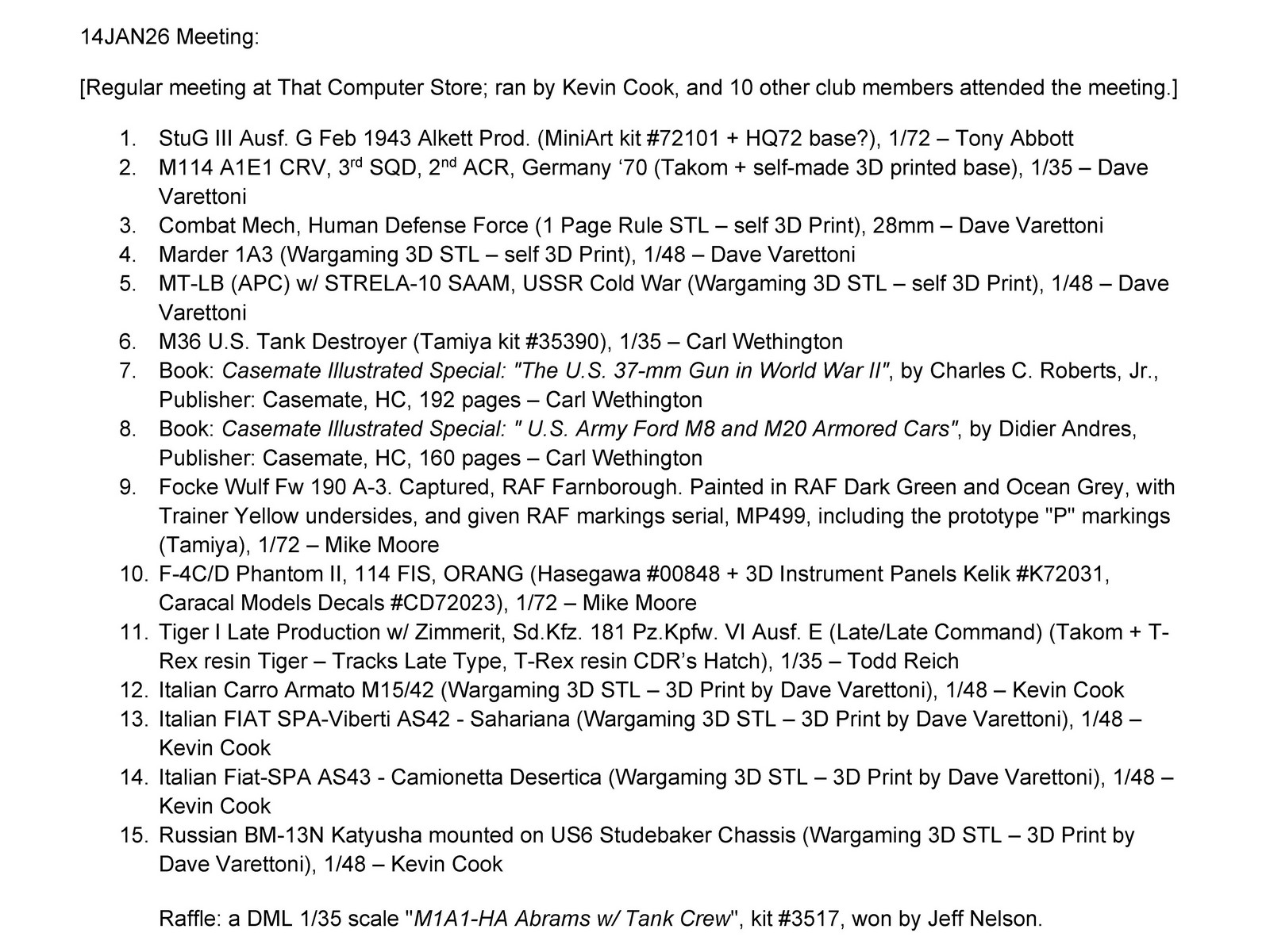 NEW! January 14, 2026 (Our last meeting was held on Tuesday, January 14, 2026, from 6 – 8 pm at That Computer Store, 275 Harbison Blvd. Suite P Columbia, SC 29212. We had 11 club members attended the meeting. Kevin Cook ran the meeting, and some of the members brought 15+ models, books and model related items for Show & Tell. For the Raffle, we had a Dragon 1/35 scale “M1A1-HA Abrams w/ Tank Crew”, kit# 3517, won by Jeff Nelson [that makes 19 M1 kits, he might have a problem].)