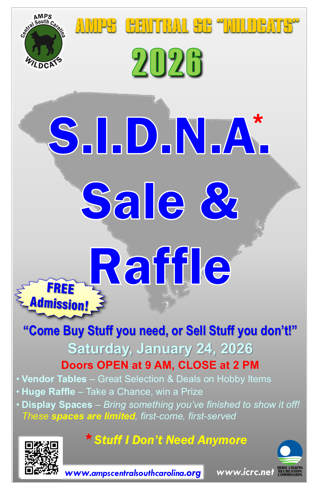 NEW 04NOV25! Mark your calendars for January 24, 2026, when we plan to hold the 2026 S.I.D.N.A. Sale and Raffle. This event will be held in the Live Oak Center rooms of the 7 Oaks Park Recreation Center, and will include Vendor Tables, a HUGE Raffle just like we have had at our most recent Mega Shows, and even some tables for Display Spaces to show off some of your recent work.
